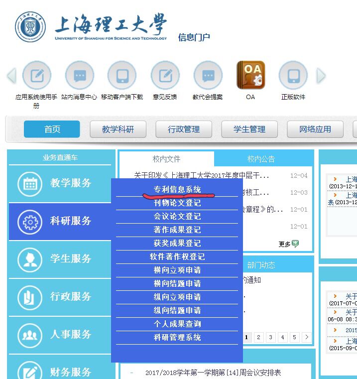 登录专利信息系统路径如下:学校首页-OA办公系统—科研服务-专利信息系统。