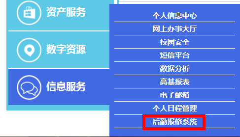 现为了方便广大师生在信息门户中及时报修,报修链接方式:登陆信息门户→业务直通车→信息服务→后勤报修系统,欢迎大家方便使用并提宝贵建议。