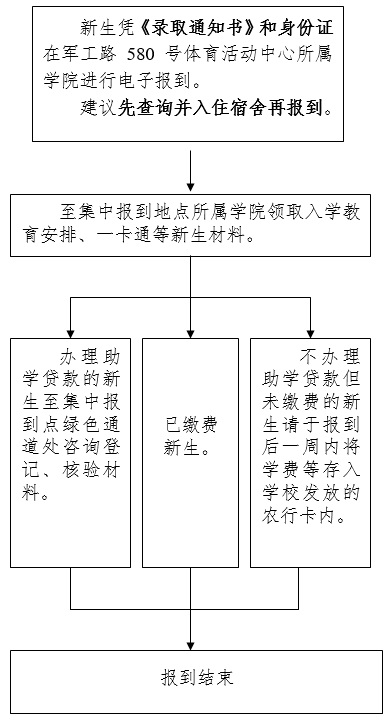 3.校园一卡通、入学教育安排等材料在军工路580号体育活动中心所属学院报到点领取,晚到新生到学院辅导员处领取。