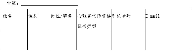 四、参与人员:学校专兼职心理老师、心理咨询师联盟成员、学生辅导员、班主任等,各学院可推荐1-2人参加。