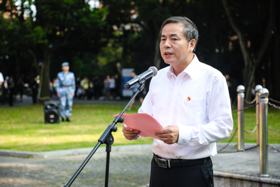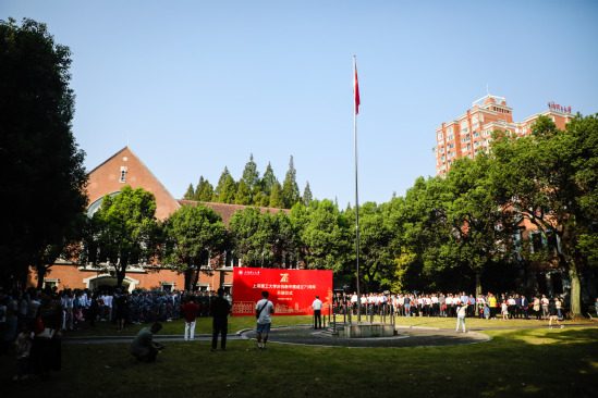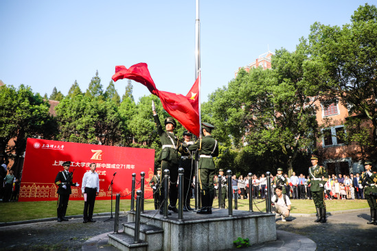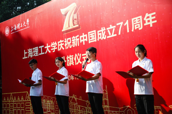鲜艳的五星红旗在学校国旗护卫队同学英姿飒爽地护卫下入场,在雄壮的国歌中声冉冉升起。参加仪式的全体师生肃然而立,行注目礼,向新中国71周年华诞献上最真挚的祝福。学生代表韩问涯、王泰淇、李沁宜、朱南迪满怀深情地向祖国献词《波澜壮阔七一载 乘风破浪正当时》,讲述了在疫情期间上理青年勇挑重担,用智慧为抗疫工作提供助力的故事,号召青年学子认真学习领悟“四史”,汲取营养、传承精神,在新时代乘风破浪。