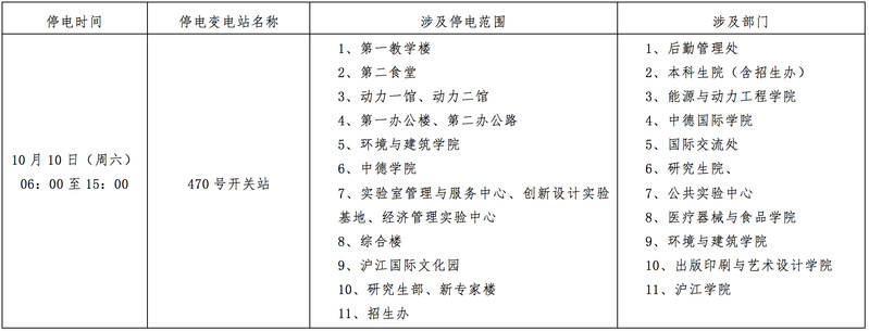 根据市区供电公司通知, 470号开关站需断电施工,停电时间为10月10日(周六)早6:00至下午15:00,停电影响范围较大。为保障正常教学开展,第一教学楼、综合教学楼、中德学院停电期间采用临时供电,以满足照明及多媒体教学,但不支持空调及大功率电器的使用。在此期间给在校工作和学习、生活的师生带来不便,敬请谅解。