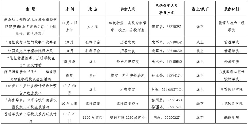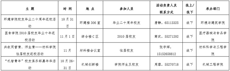 3、为使本次返校活动内容更加丰富,欢迎广大师生校友就校友活动安排提出建议,欢迎各学院、地方、行业校友会组织、承办各类线上线下校友活动。