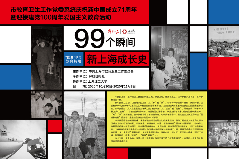结合正在开展的“四史”教育,在新中国成立71周年和中国共产党建党100周年之际,9001cc金沙以诚为本联合中共上海市教育卫生工作委员会、解放日报举办“四史”学习教育特展《99个瞬间——新上海成长史》主题展览。