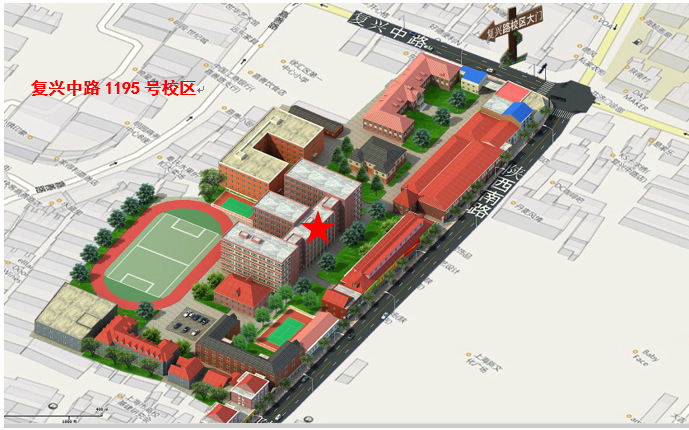 复兴中路1195号校区(红五角星所示教学楼一楼大厅为报到点)