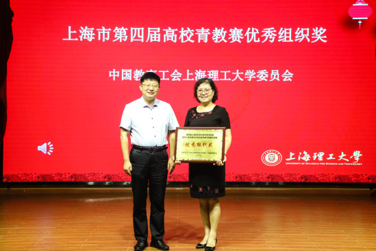 张华为第四届上海市高校青年教师教学竞赛优秀组织奖单位——校工会授牌
