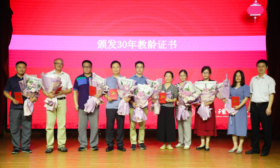 孙跃东宣读“30年教龄教师名单”,丁晓东为30年教龄教师颁发荣誉证书。