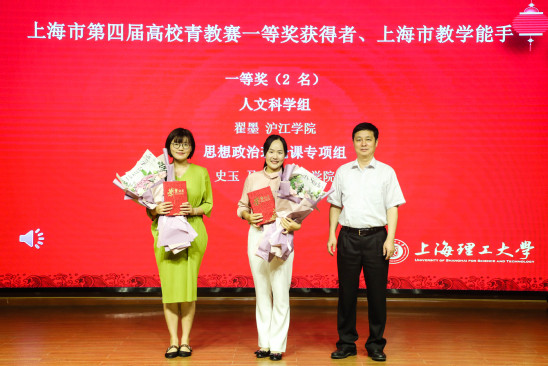 丁晓东为第四届上海市高校青年教师教学竞赛一等奖获得者、上海市教学能手史玉、翟墨颁奖
