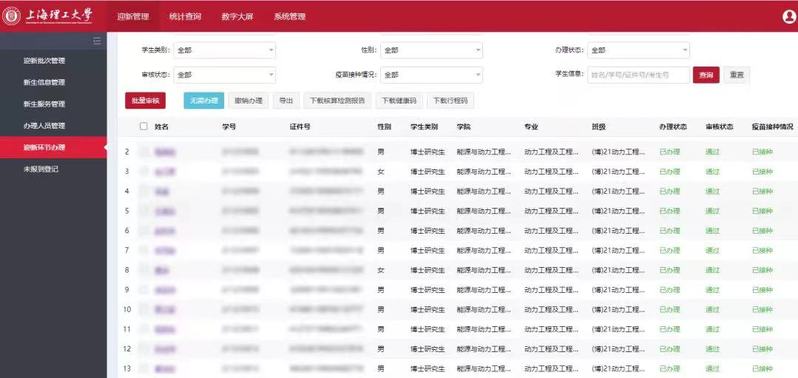 为确保迎新和防疫“两手抓、两不误”,各学院辅导员按照学校疫情防控管理要求,提前对新生入学报到的各项工作做了周密安排。对于尚在风险管控地区的新生,学校老师通过电话、WeLinK等消息渠道提前主动联系,给予新上理人第一份关怀。在新生报到前迎新系统开放的2天内,各学院辅导员夜以继日完成数百名新生的审批工作,在保证防疫材料时效性的同时,确保新生报到当天顺利进校。