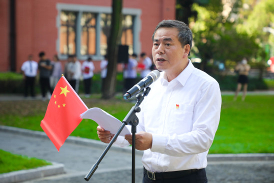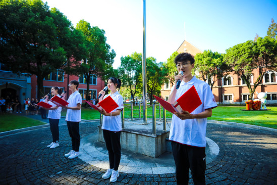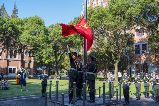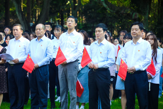 上午8时,在师生的深切期盼和热切注目下,国旗班同学身着戎装、雄姿英发。他们迈着矫健的步伐走向升旗台。激昂的国歌声响起,五星红旗冉冉升起,师生齐唱国歌,向伟大祖国献上美好祝福。大学生艺术团王泰淇、蒋事博、袁潇语、许安宁同学向祖国献词,在国旗下庄严承诺“不负青春,强国有我”,铮铮誓言展现了青年一代的蓬勃朝气。