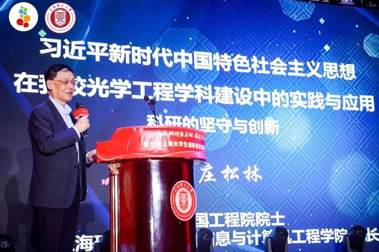 庄松林院士为本届成果展做了题为《习近平新时代中国特色社会主义思想在上理工光学工程学科建设中的实践与应用——科研的坚守与创新》的主旨演讲。庄松林从科技工作者的使命与责任、促进产业升级、服务经济主战场、助力健康中国、服务公共安全等几个方面,给与会师生上了一堂丰富多彩的教育、科技、思政、创新创业课。