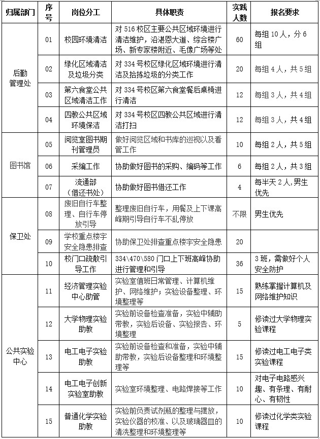 “我是光荣劳动者”主题实践教育活动由党委研究生工作部发起、机械工程学院承办,学校后勤管理处、保卫处、图书馆和公共实验中心四部门联合为在校研究生提供了15个不同类别的劳动实践体验岗位,岗位详情见下表: