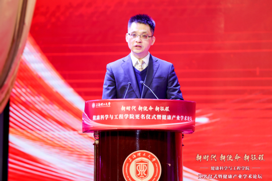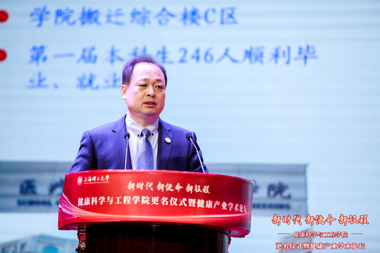 12月19日上午,健康科学与工程学院更名仪式暨健康产业学术论坛在大礼堂举行。中国工程院院士、健康科学与工程学院名誉院长王威琪,校党委副书记孙跃东,原副校长郦鸣阳,上海市市场监督管理局食品安全协调处处长朱梓明,上海市经济和信息化委员会生物医药产业处副处长陈敦,上海市药品监督管理局医疗器械监管处领导、行业与企业单位嘉宾、学院党建联建单位嘉宾、学校相关职能部处领导、学院全体教师、校友代表及学生代表共同参加仪式。仪式由学院党委书记姚秀雯主持。
