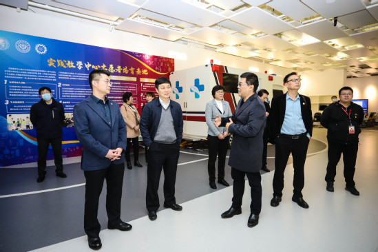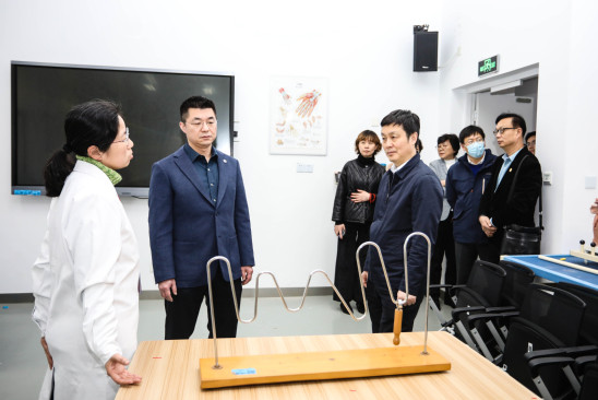 座谈会前,丁晓东一行在吴韬等人的陪同下参观了上海健康医学院健康互动实训中心及康复学院。