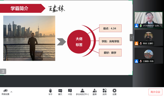 “今天我们主要讲讲基础知识夯实、练习与强化、考研竞赛总结、数理思想在工程中的应用四大板块……”晚上6点,校学生学业发展中心联合基础学院举办的“学霸课堂”正式开讲,光电学院的王嘉栋正在给学弟学妹们讲高数,吸引了近千名大一学生涌进直播课堂,点赞量超过3.1万。