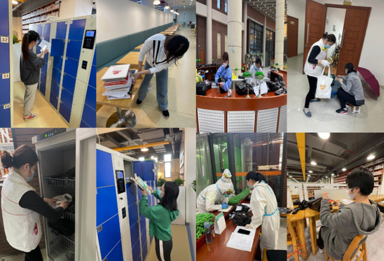 除送药外,同学们代取学习用品的诉求也很迫切,图书馆全体在校教职工迅速响应。在学生视频指引下,逐一确认、取出因临时闭馆滞留在各楼层寄包柜、置物架等处的图书资料,经过紫外线消毒机“零死角”消杀后,进行打包派送,一天之内就完成了百余名师生的取书需求。