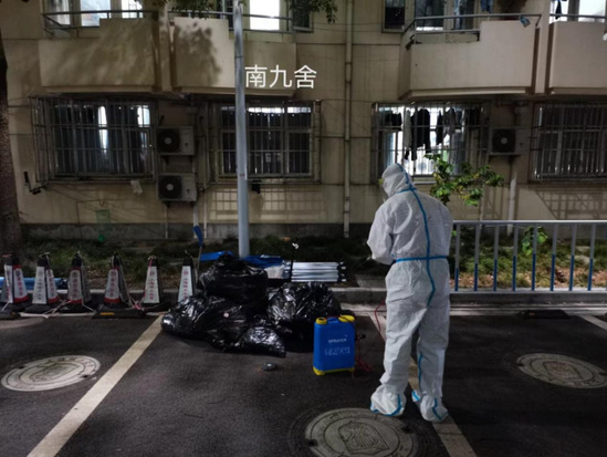 校内核酸采样组志愿者做好防护,准备进楼采样