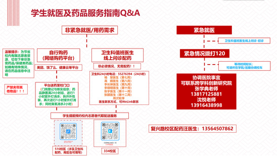 严格落实校外药品静置满24小时后,进行1小时紫外灯消杀,拆开外包装,再次进行1小时紫外灯消杀;网购药品安排专门配送志愿者,全程穿戴防护服、佩戴面屏等装备,单独设置配送路线,做到不交叉……为了缩短网购药品从校门到师生手中的时间,学校发布了“就医及药品服务指南”,并组建了紧急药品配送的志愿者团队。