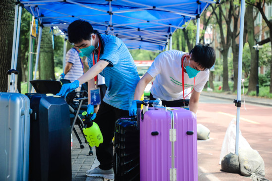 毕业典礼当天,还有一些身在学校、原本可以坐在大礼堂参加线下毕业典礼的同学,然而他们却主动报名参与到当天的志愿服务岗位上,在各个校门口为安置行李的毕业生们进行入校检查、消毒等工作。