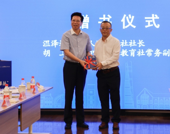 新书由国务院新闻办公室原主任、上海公共外交研究院专家咨询委员会主席、“公共外交译丛”顾问赵启正和上海市政协副主席、上海公共外交研究院理事长、“公共外交译丛”主编周汉民共同揭幕,丛书编委和顾问代表见证了这一光辉时刻。随后,温泽远代表编委会向上海中华职业教育社常务副社长胡卫赠书,感谢协办方的大力支持。