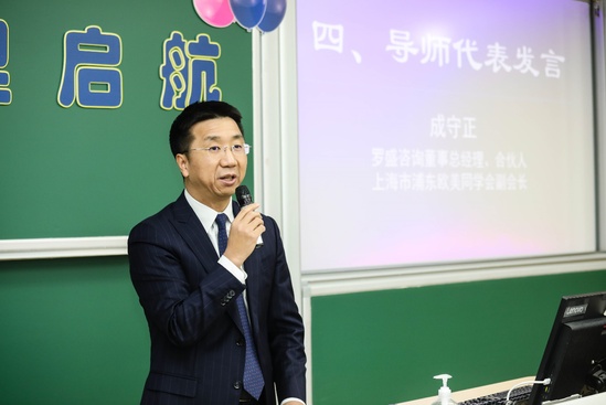 罗盛咨询董事总经理、合伙人,上海市浦东欧美同学会副会长成守正校友作为导师代表发言,他深情回忆起母校的点点滴滴,赞扬了上理学子一以贯之的低调务实品格,希望以身作则,脚踏实地为学弟学妹们汇集资源、答疑解惑、指引未来。
