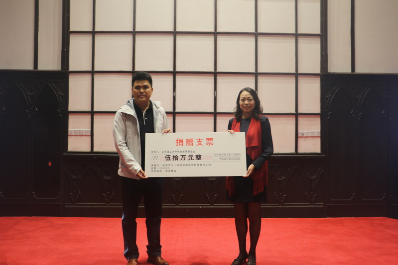 曹桂馥首先向大家介绍“奔奔基金”设立的背景及首届“奔奔奖学金”评选的有关情况。建环系2000级校友、(奔奔灵工)湖南焕强信息科技有限公司董事长史乐乐,向学校捐赠50万元设立“奔奔基金”,旨在加强环境与建筑学院学风建设,学院结合实际设立“奔奔奖学金”,共分为学习标兵奖、学业进步奖、学术深造奖以及学风促进奖四个类别。捐赠方代表史乐乐、受赠方代表司徒唯尔共同在现场进行捐赠仪式。
