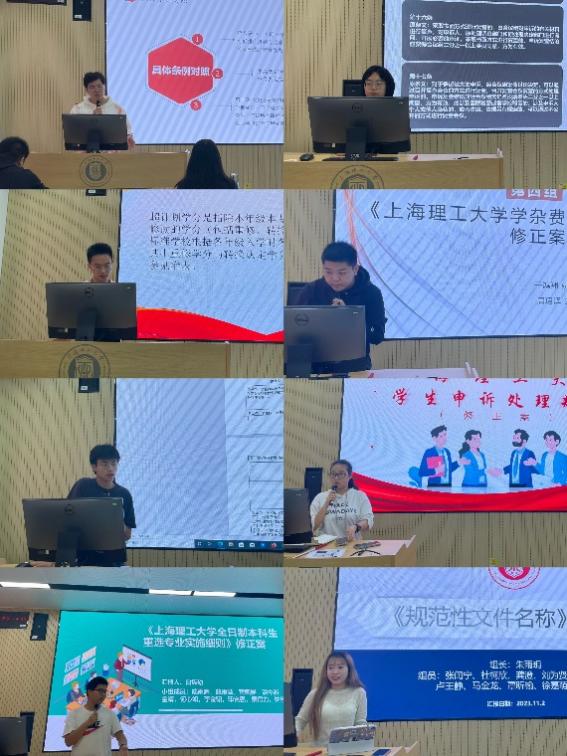 这并非校级决策议事场景,而是《习近平法治思想概论》课的结课作业展示。11月1日上午和11月2日上午,两个班的18个小组展示了汇报修改或制定校内规范性文件的结课作业。