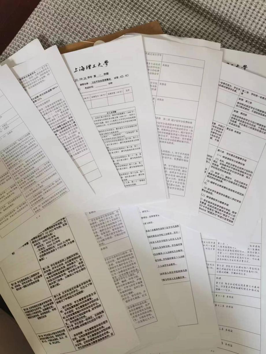 通过资源拓展、实践引导,让习近平法治思想入脑入心,《习近平法治思想概论》这门课在经过三个学期的探索以后,早已深受同学们的喜爱。本学期,张剑文老师创新课程考核方式,给同学们布置了一个富有意义的任务:请学生自行组队,根据自己的观察和经验来修订或制定一项校内规范性文件。