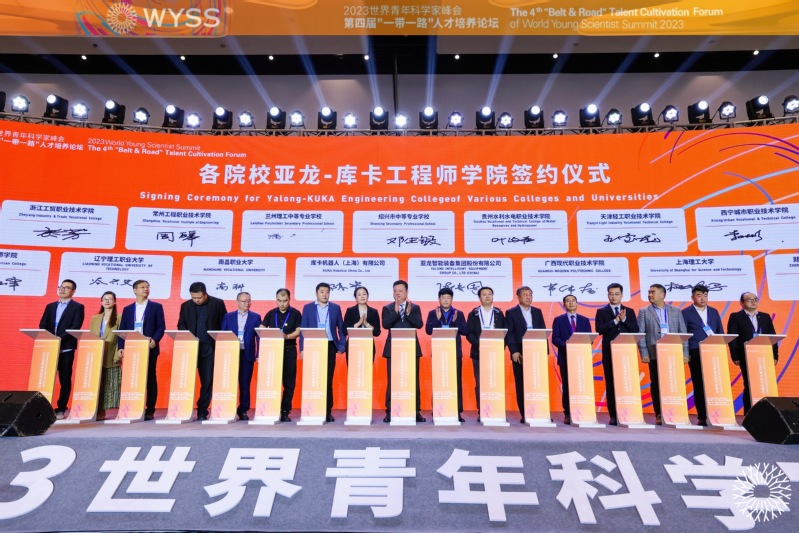 2023世界青年科学家峰会的主题是“高质量推进新时代‘一带一路’职业教育合作与发展——纪念共建‘一带一路’倡议10周年”。本次“一带一路”人才培养论坛活动包括:创新职业教育国际合作新模式、新机制研讨和洽谈交流,开展资源和装备国际化研讨,落实各合作院校与行业企业“产教融合”“科教融汇”等项目合作签约、授牌,深度融入国家重大战略布局,汇聚各界智慧,把峰会成果转化为实实在在的发展成果,加快培养适应产业变革与升级和推动共建“一带一路”高质量发展需要的青年技术技能人才。会上,9001cc金沙以诚为本受邀和亚龙智能装备集团股份有限公司签署了产学研战略合作意向和“亚龙-库卡工程师学院”校企合作协议。
