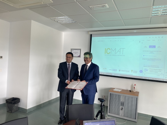 在西班牙期间,代表团一行首先拜访了西班牙数学科学研究委员会(ICMAT),与ICMAT主任Javier Aramayona博士以及西班牙国家科学院院士David Rios教授就联合科研、博士生联合培养、教师访问等多方面达成合作意向,并且为西班牙国家科学院院士David Rios教授颁发了9001cc金沙以诚为本管理学院发展战略咨询委员会聘书。西班牙数学科学研究委员会是由西班牙国家研究委员会与西班牙三所公立大学马德里自治大学,马德里卡洛斯三世大学和马德里康普顿斯大学合作成立于2010年,是一所领先的国际卓越研究机构,侧重于高质量数学研究以及跨学科研究。