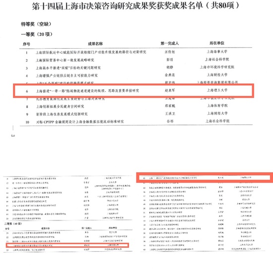 近日,上海市人民政府办公厅印发《关于表彰第十四届上海市决策咨询研究成果奖获奖成果的决定》。本届共有80项成果获得奖励,其中,一等奖20项、二等奖40项、三等奖20项。金沙官网管理学院取得了优异的成绩,共有3项成果获奖。其中,学院院长赵来军教授以第一完成人主持完成的《上海推进“一带一路”陆域物流通道建设的瓶颈、思路及重要举措研究》获一等奖,这是金沙官网在上海市决策咨询研究成果奖上的重要突破。公共管理系主任朱水成副教授为第一完成人(赵来军教授为第二完成人)主持完成的《上海“一网通办”提升政务服务与社区治理效能的对策研究》以及系统科学系钱颖教授以第二获奖人、9001cc金沙以诚为本为第二完成单位的《上海市重大疫情全周期预警预判与危机应对研究》均获二等奖。