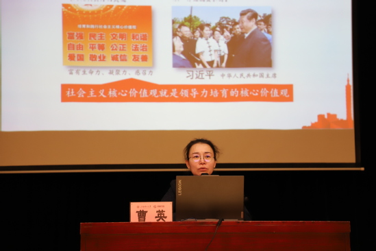 曹英作题为“学党章,努力成为合格的大学生党员”的专题报告。她紧紧围绕党章,从成为合格大学生党员基本条件的5个方面展开,通过比较中国国产党和其他政党的不同之处,加深学员对中国共产党的认识,明确只有坚定信仰才能更好地树立入党动机,才能更好地为人民服务。曹老师指出,要以学习党章为指引,脚踏实地做学问,不断丰富自己的知识,在新征程上连续奋斗,展现新时代青年党员的风貌。