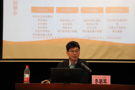 李朝军以“以中国式现代化,推进中华民族伟大复兴”为主题向学员授课。他以党的二十大报告为蓝本,从回应时代之变、解答时代之问、走进时代新纪元三个方面解读二十大精神,提出学员要将党的二十大报告精神“学思用贯通、知信行统一”。通过对中国式现代化的特点的阐述,强调了中国式现代化的精神内涵和首要任务,加深学员对其意义的理解。最后,他呼吁学员时刻保持清醒和定力,以党的自我革命引导社会革命,领会时代赋予的责任,勇于锤炼实践能力和创新能力。