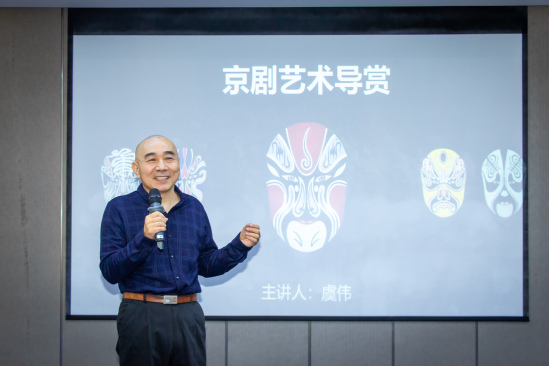 京剧是国家级非物质文化遗产,是积淀了中华民族文化传统的艺术瑰宝。虞伟老师结合自身丰富的经历生动介绍了国粹京剧的来源、发展、行当特征等。他介绍到,京剧的演变经历了多个阶段,初期以“二黄”和“徽调”为主,随后融入了川剧、豫剧等地方元素,形成了独特的艺术风格,其深厚文化底蕴和独特表演风格,使得京剧成为中国传统戏曲文化的杰出代表,为戏曲艺术的现代发展奠定了坚实基础。他强调:“京剧代表了中国的文化,是民族的,更是世界的。”150年来,京剧不仅在中国文化中扎根深厚,在国际上也享有盛誉,成为中国文化走向世界的一张靓丽名片。