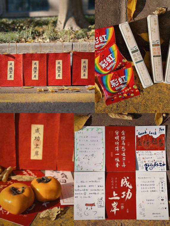 活动精心准备了百余份小礼物,每一个都寄予着理学院对考研学子的美好寓意:饱满可爱的柿子寓意考生能够“柿柿”如意,心想“柿”成;一支神笔则希望考生用那满腹经纶能够“下笔如有神”递交一份完美答卷;甜蜜蜜的糖果亦希望考生能够感受到拼搏后满载而归的甜;明信片上写满了理学院老师、学弟学妹、学长学姐们对考研学子的满满祝福和殷殷期待,愿考生能够成功上岸,一研为定,旗开得胜。