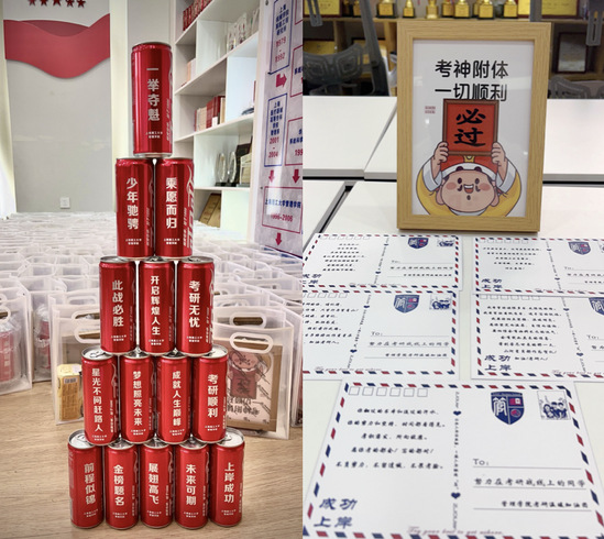 礼包的搭配也饱含了学院的温暖祝愿,写着“考神附体 一切顺利”“必过”的相框、每个人不同祝福语的暖心手写贺卡、薯愿薯片、士力架、定制可口可乐,即:愿“薯”于每个莘莘学子的愿望,考神附体一切顺利,最终获得可喜“可乐”的好结果。一份份情真意切的祝福,希望学子们能在备考过程中事半功倍,考研结果功不唐捐。
