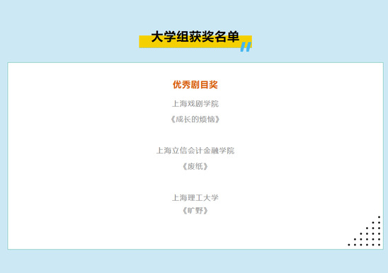 12月15日,第二届上海校园戏剧节闭幕式暨颁奖仪式在复旦大学举行,现场公布了本届戏剧节的获奖名单。全市来自小学组、初中组、高中组、大学组及校外组的入围作品,分别于11月21日至12月7日在上海话剧艺术中心、上海师范大学进行展演、评审。最终,共有21部作品获得本届上海校园戏剧节“优秀剧目奖”。