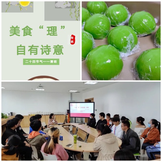 清明时节,食品专业的张颖老师,为大家分享青团的制作方法以及青团中常用的食品添加剂、色素、防腐剂等专业知识,同学们了解了青团这一食物的制作流程,学习到了清明节的传统文化和习俗由来。