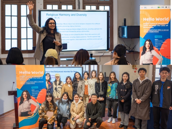 来自学院工商管理专业的讲师普里扬卡·达斯(Priyanka Das)以“宝莱坞视角下的印度社会文化认同”(Social Cultural Identity of India through the Lens of Bollywood)为主题,为让学生们更好地理解印度文化,她以宝莱坞的背景以及印度传统节日为切入点,选取了多部经典宝莱坞电影片段向同学们多方面诠释了丰富的印度文化以及其面对的各类社会问题,其中包括印度传统节日、家庭文化、包办婚姻与爱情婚姻的冲突以及对于社会歧视的探索等。