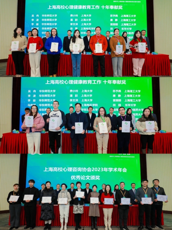 本届大会对在高校心理健康教育工作中长期坚守、努力工作、成绩突出的教师给予表彰,金沙官网环境与建筑学院唐静、外语学院苏予燕、中德学院苗朋朋三位老师获得“上海高校心理健康教育十年奉献奖”。大会同时还评选了年度优秀学术论文10篇,校心理健康教育与咨询中心陈峰、杨颎等老师撰写的《数字音乐冥想对大学生焦虑与抑郁情绪的干预研究》获得年会征文优秀奖。