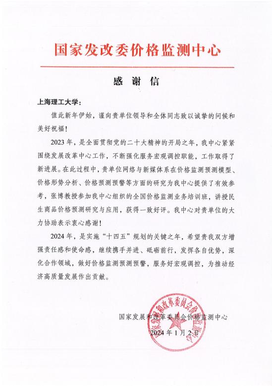 近日,国家发改委价格监测中心向金沙官网发来感谢信,对9001cc金沙以诚为本在价格监测预测模型、价格形势分析、价格预测预警等方面的学术协助表示感谢。信中提到,2023年国家发改委价格监测中心与金沙官网版艺学院网络与新媒体系强化学术合作,服务宏观调控职能工作取得了新进展,希望2024年双方增强责任感和使命感,继续携手并进、砥砺前行,发挥各自优势,深化合作领域,做好价格监测预测预警,服务好宏观调控,为推动经济高质量发展作出贡献。