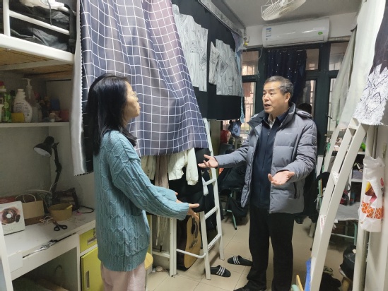 盛春带队深入四公寓一号楼、四公寓二号楼,实地走访相关学生寝室,深入了解新学期学生学习生活状态,仔细检查学生寝室相关安全事项,并叮嘱学生时刻守住安全底线,杜绝使用违章电器,消除可能存在的安全隐患,把寝室打造成安全、温馨、和谐的“暖心小家”。结合实地走访中反馈出的相关问题,盛春要求相关职能部门及时做好对接处置,切实筑牢安全底线。