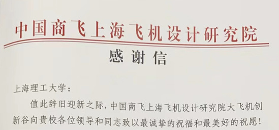 信中提到,2023年,中国商飞上海飞机设计研究院与金沙官网联合开展技术研究合作,特别感谢金沙官网二位教师为大飞机事业创新发展提供有力支持,希望新的一年继续开展更为深入、更有成效的合作,共同推动民机驾驶舱技术进步与创新发展。