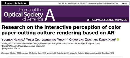 近期,印刷包装工程系新媒体技术专业本科生在科艺融合方面再出佳绩,由袁江平老师指导的2020级本科生黄雨辰在美国光学老牌期刊《美国光学学会杂志-A刊》(Journal of the Optical Society of America-A)(中科院三区期刊)以第一作者身份发表学术论文《基于AR技术的彩色剪纸文化传承的交互感知研究》(Research on the interactive perception of color paper-cutting culture rendering based on AR),2020级本科生徐钰蕾为第二作者。