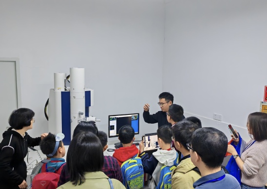 在材化学院赵月峰老师的带领下,小朋友们首先来到了位于化学实验中心一楼的透射电子显微镜实验室。通过透射电子显微镜可以看到在光学显微镜下无法看清的纳米尺度的细微结构。在实验室研究生学长的指导下,小朋友们自己动手操作透射电镜观察提前准备好的乳白色试剂。只见一个个排列整齐的原子展现在显示屏上,再放大数倍后可以清晰的看到原子表面不规则的纹理。“这是我第一次用大型实验仪器观察微观世界!”小朋友们兴奋地说道。