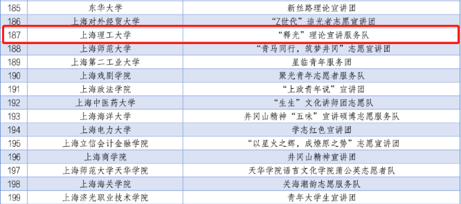 “释光”理论宣讲服务队依托光电学院本科生第六党支部建立,10名成员皆为该支部的党员。近年来,团队围绕学习宣传习近平新时代中国特色社会主义思想主线,突出党的创新理论“青年化”阐释主题,引导新时代大学生讲党的初心故事、做红色基因传承人。团队开发理论宣讲微课程曾荣获第五届全国高校大学生微电影展示活动优秀奖、2023年“知行杯”上海市大学生社会实践大赛三等奖和上海市大学生理论宣讲社团优秀案例等。入选后,团队将以学习宣传井冈山精神为内容,以突出党的创新理论“青年化”阐释为方向,通过实施实景式体验党课、浸润式红色党课、团体式朋辈传承和服务式先锋引领为路径,开展理论宣讲进学班级、进支部、进学生组织、进社区。