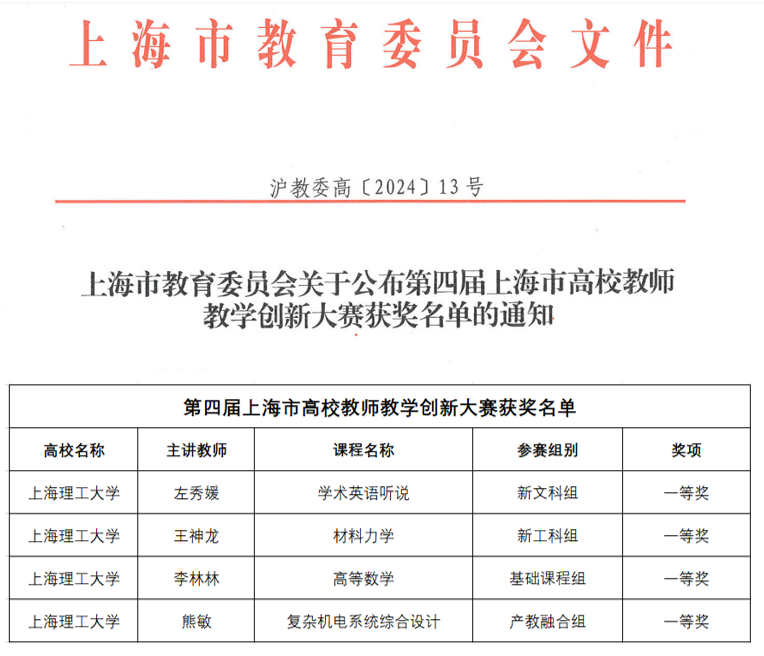 根据《上海市教育委员会关于公布第四届上海市高校教师教学创新大赛获奖名单的通知》(沪教委高[2024]13号),金沙官网获得了4项一等奖的历史最佳成绩,学校同时获评“优秀组织奖”。