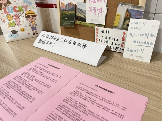 宿舍走廊上精心布置了涂鸦板,往来的毕业班同学纷纷拿起画笔,在涂鸦板上留下了自己的专属创作,生动的符号代表了他们对这段校园时光的真实感受。在涂鸦墙旁的留言墙上,同学们书写了对学院老师、宿舍阿姨、同窗好友的不舍之情。平日里的点滴,在此刻汇聚成了动人的文字,诉说着青春独有的故事。