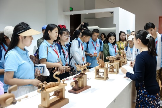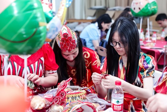 上理学子展示了《祖国,或以梦为马》《少年中国说》等朗诵节目,代表团学生带来了舞蹈《新疆是个好地方》和戏曲《说唱脸谱》等节目, “民族团结模范家庭”马玉英和张耀辉夫妇带来《双人舞》表演。此外,玛丽亚民族团结工作室的“书声意气”团队将第429 期 “读书分享会”也带到交流会现场,带领新疆师生沉浸式体验了一场特殊的读书沙龙。临近传统节日端午,导读人由分享文学作品引入,讲解了我国各传统节日知识,并与在场代表团学生展开趣味问答和制作端午香包等生动有趣的互动。交流会后,代表团参观了玛丽亚民族团结工作室和机械艺术博物馆。