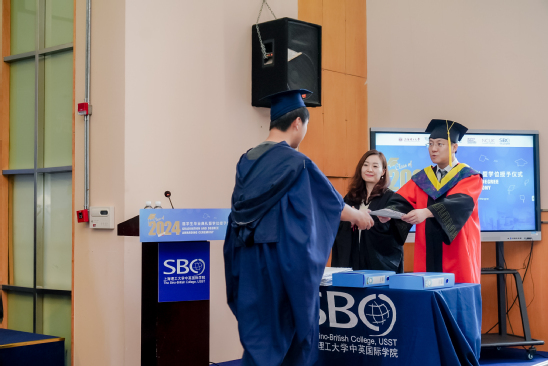 学位授予仪式上,单彦广宣读毕业生名单。中英双方院校领导为毕业生逐一拨穗正冠、握手勉励,并与毕业生合影留念。学术导师和专业负责人为毕业生颁发证书。
